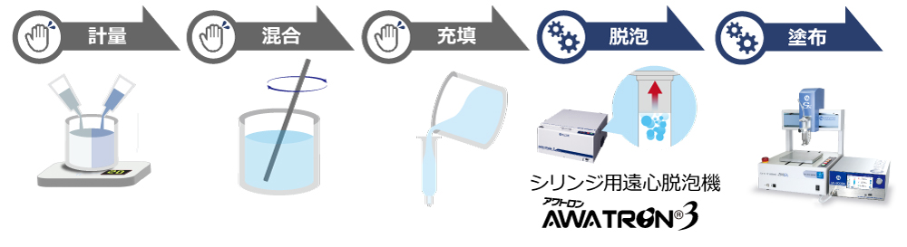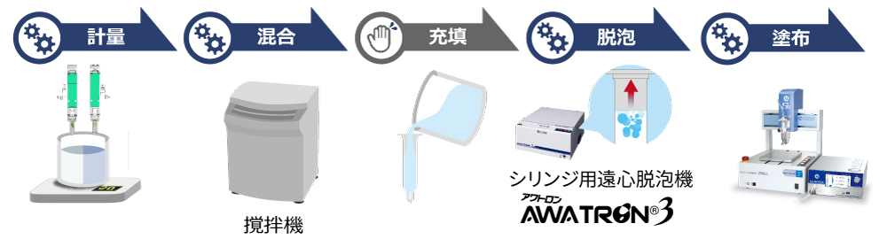 在2液体混合和涂布进行工程中,除了上述的点胶机·搅拌机之外,还需要罐、称量器、脱泡器等各种各样的配件。