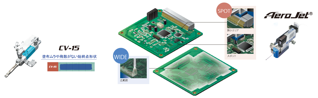 本公司的喷气式飞机式点胶机“AeroJet”可以很好地吐出液剂,从喷嘴前端飞翔。另外,基板的涂层用的5mm到30mm以上的长喷嘴也在产品,在点胶机和实装零件容易干涉的狭窄区域也可以涂抹。
