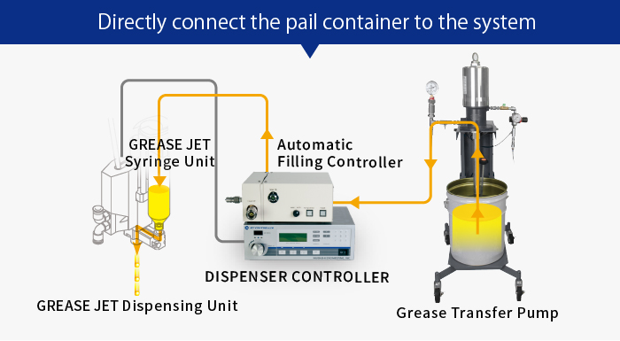 格里斯的更换工作,在麻烦的同时,工作中液剂气泡进入,成为涂布不良的原因。使用喷气式飞机点胶机的情况下,本公司提出了可以直接设置格栅罐的罐输送系统化机器・液罐涂布系统化机器的组合方案。